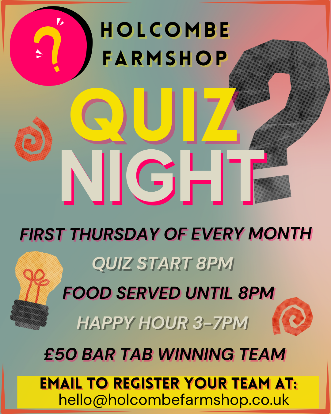 Quiz nights are very popular therefore booking is essential. To book for our next quiz, call our team on 01761 233731 or send us an email: hello@holcombefarmshop.co.uk